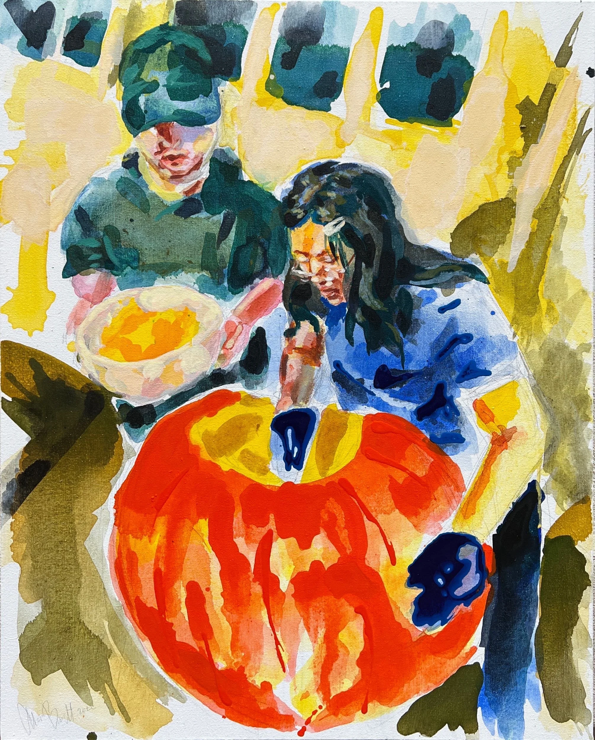Through figurative painting I find ways to honor and grieve the fragile parts of myself I don’t always want to remember, but more often than not am too afraid to forget. Using watered down acrylic and inks,I paint the way my memory feels: quick, fragmented, unfinished. I use canvas in a very physical process, exploring the limits of my materials, while also encouraging them to move and react naturally.My work stems from the feelings of abandonment and rejection caused by my identity, and often reinforced by those closest to home. Even still, I take an optimistic and ,I’d argue, even rebellious stance of joy. Creating more intensely through these past few years my work positions itself into an escape from the news, pairing loud saturated colors with quiet scenes of pleasure. I paint to capture the liveliness and intimacy of a quick moment turned memory: the kind that pulls you to a better perspective, like touching grass after scrolling on social media for hours on end. My pieces act as an excavation of memories I’ve buried deep and as a conservation to ones I wish to stay on the surface. It lies as a path to the viewer, to bring them back home to the people and places they too couldn’t bear to forget.